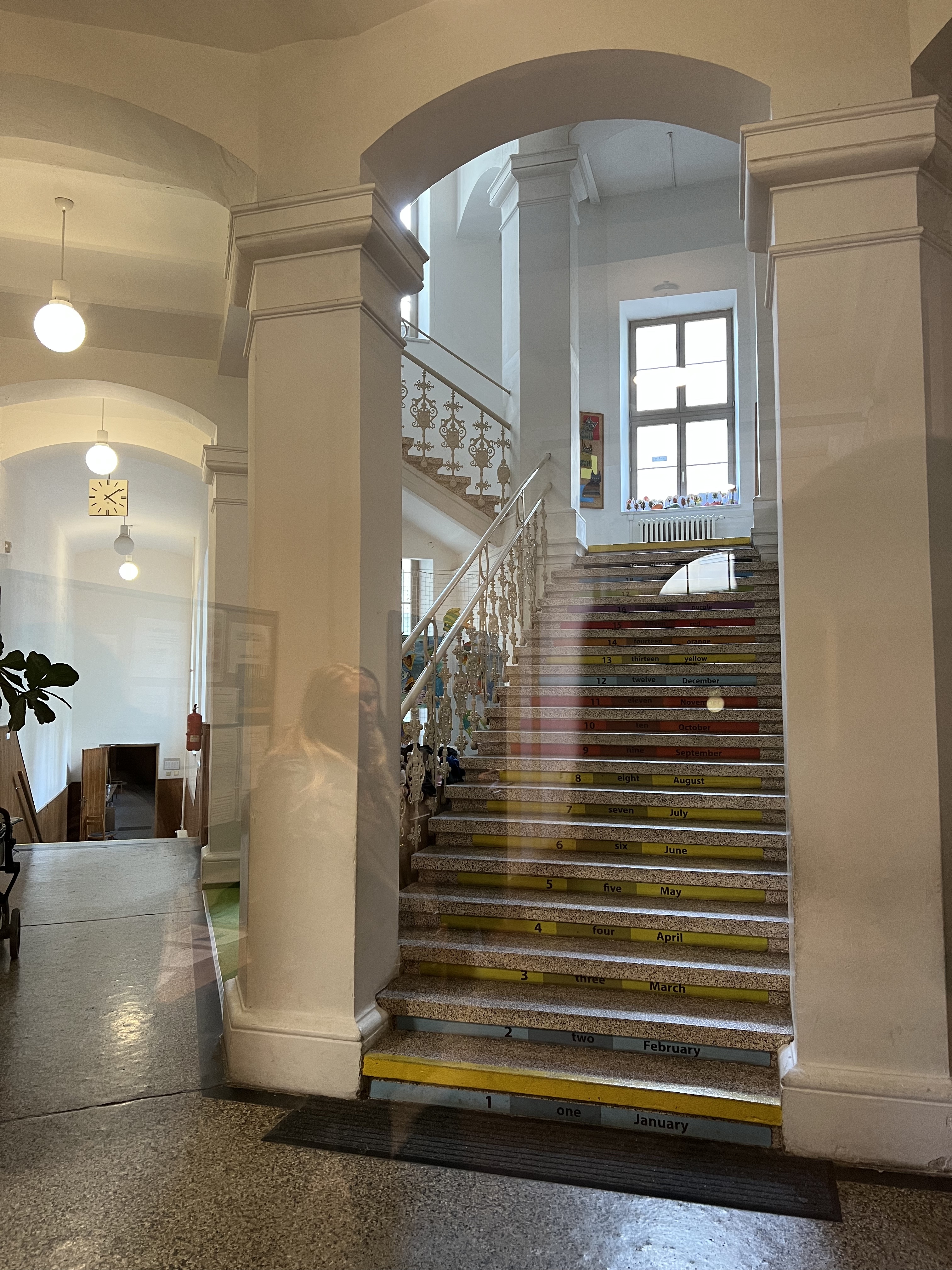 My job is to wait. At the end of the hall are two glass-paned doors, locked from my side. I wait and wonder what’s taking so long, and then she appears from another door, heading for the grand staircase to her classroom. We wave and blow kisses as she climbs. I get a wave halfway up and another from the top. Just before she disappears, she ducks to peer back through a gap between columns for one last wave, then straightens up and enters her world.